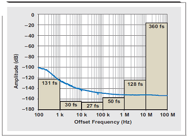 時鐘鏈(振蕩器、時鐘緩沖器或 PLL)中器件的輸出抖動一般規(guī)定在某個頻率范圍內(nèi),該頻率通常偏離于基本時鐘頻率 10 kHz 到 20 MHz(單位也可以是微微秒或者繪制成相位噪聲圖),可以將其整合到一起獲取抖動信息。但是,低端的 10kHz 和高端的 20MHz 有時并非正確的使用邊界,因為它們調(diào)試依賴于其他系統(tǒng)參數(shù),我們將在后面進(jìn)行詳細(xì)介紹。圖 6 描述了設(shè)置正確整合限制的重要性,圖中的相位噪聲圖以其每十倍頻抖動內(nèi)容覆蓋。我們可以看到,如果將下限設(shè)定為 100-Hz 或 10kHz 偏移,則產(chǎn)生的抖動便極為不同。同樣地,例如,設(shè)置上整合限制為 10 或 20MHz,可得到相比 100MHz 設(shè)置極為不同的結(jié)果。