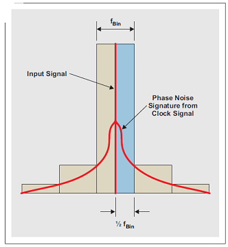 在采樣過程中,輸入信號與采樣時鐘信號混頻在一起,包括其相位噪聲。當(dāng)進(jìn)行輸入信號 FFT 分析時,主 FFT 容器 (bin) 集中于輸入信號。采樣信號周圍的相位噪聲(來自時鐘或輸入信號)決定了鄰近主容器的一些容器的振幅,如圖 7 所示。因此,小于 1/2 容器尺寸的偏頻的所有相位噪聲都集中于輸入信號容器中,且未增加噪聲。因此,相位噪聲整合帶寬下限應(yīng)設(shè)定為 1/2 FFT 容器尺寸。 FFT 容器尺寸計算方法如下: