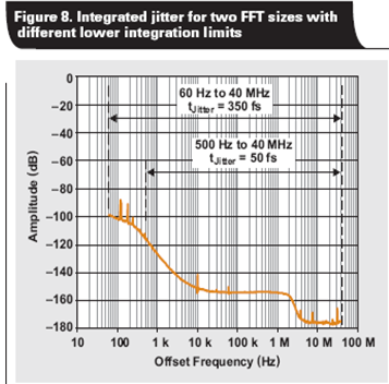 為了進(jìn)一步描述該點,我們利用兩個不同的FFT尺寸—131,072 和 1,048,576 點,使用 ADS54RF63 進(jìn)行實驗。采樣速率設(shè)定為 122.88MSPS,而圖 8 則顯示了時鐘相位噪聲。我們將一個 6-MHz、寬帶通濾波器添加到時鐘輸入,以限制影響抖動的寬帶噪聲數(shù)量。選擇 1-GHz 輸入信號的目的是確保 SNR 減弱僅由于時鐘抖動。圖 8 表明兩個 FFT 尺寸的 1/2 容器尺寸到 40MHz 相位噪聲整合抖動結(jié)果都極為不同,而“表 1”的 SNR 測量情況也反映這種現(xiàn)象。