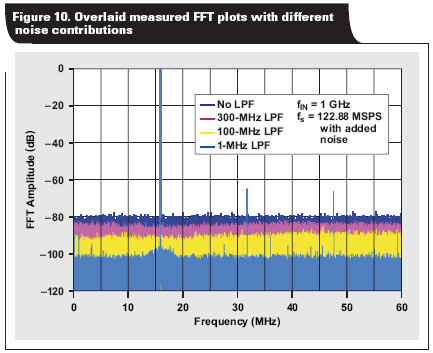 若想要驗證時鐘相位噪聲是否需要整合至?xí)r鐘輸入帶寬,則需建立另一個實驗。ADS54RF63 再次工作在 122.88 MSPS,其輸入信號為 1GHz,以確保 SNR 抖動得到控制。我們利用一個 RF 放大器,生成 50MHz 到 1GHz 的寬帶白噪聲,并將其添加至采樣時鐘,如圖 9 所示。之后,我們使用幾個不同低通濾波器 (LPF) 來限制添加至?xí)r鐘信號的噪聲量。